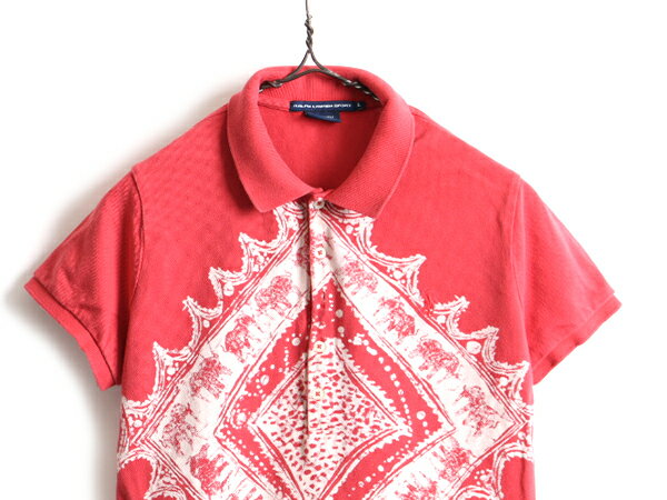 【8/20 24h限定 ポイントUP&最大半額!】 ■ ラルフローレン スポーツ ゾウ バンダナ 鹿の子 半袖 ポロシャツ ( レディース L ) 古着 ポロ POLO SPORT 半袖シャツ プリント レッド| 中古 ラルフ RALPH LAUREN 半袖ポロシャツ プルオーバー カノコ 赤 ワンポイント ポニー刺繍