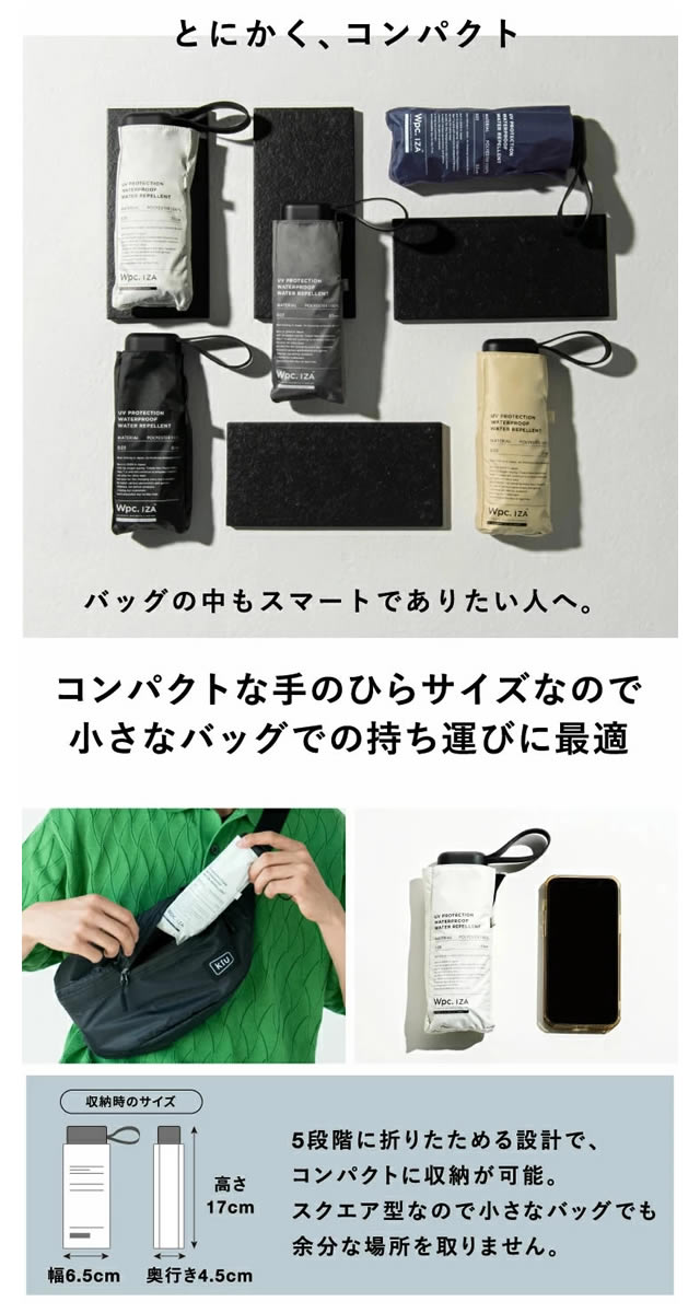 送料無料 wpc w.p.c 傘 iza TINY 日傘 折りたたみ傘 メンズ 2022年春夏新作 雨傘 コンパクト 手動開閉 完全遮光 晴雨兼用 撥水 防水 遮熱 通勤 通学 大きい 軽量 丈夫 ブランド おしゃれ 無地 uvカット100% ひんやり 53cm 黒 白 紺 ブラック ホワイト ネイビー グレー ZA003TINY (ZA003) 傘をはじめとしたレイングッズを提案するブランド、 W.P.C(ダブリューピーシー)の折りたたみ傘「IZA(イーザ)」シリーズ。