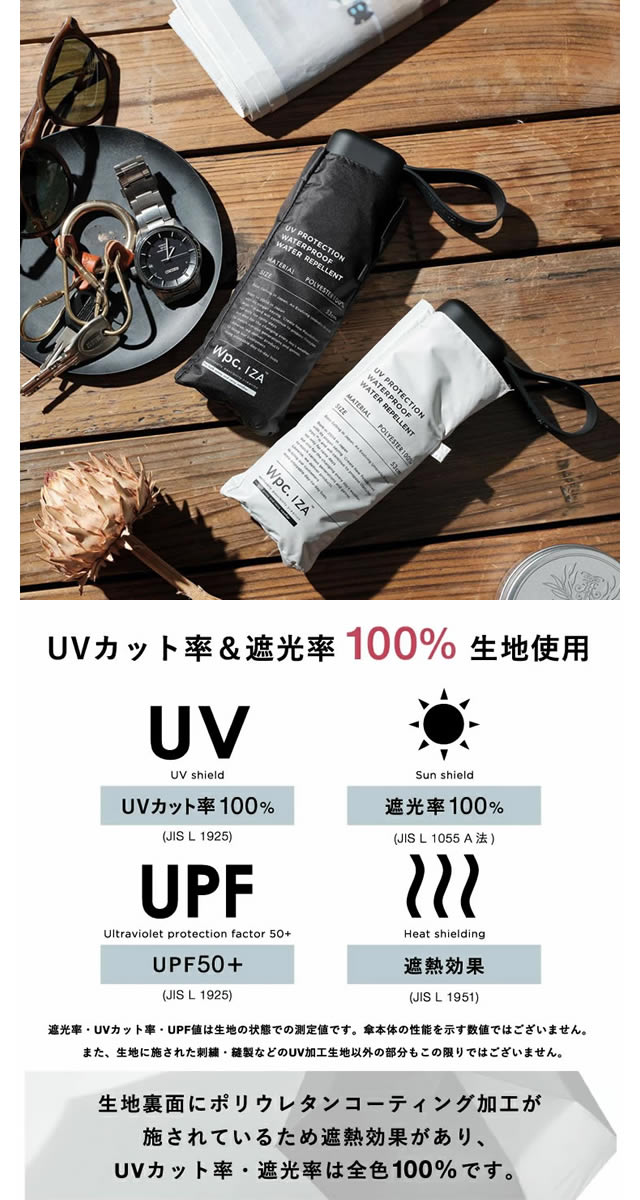 SPEC ブランド wpc. (ダブリューピーシー) 商品名 TINY (ZA003) 生産国 ・中国 素材 ・[生地]ポリエステル100% (※PUコーティング) ・[手元]プラスチック(ABS樹脂) 素材別お手入れ方法 ※下記参照 仕様 ・[開閉]手動開閉 ・晴雨兼用 ・完全遮光 ・完全UVカット ・撥水防水加工 ・収納ケース付き 注意点 ・生産や入荷時期により仕様やデザイン、型番等が異なる場合がございます。