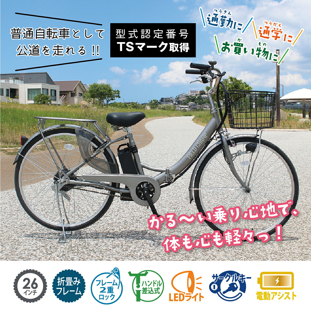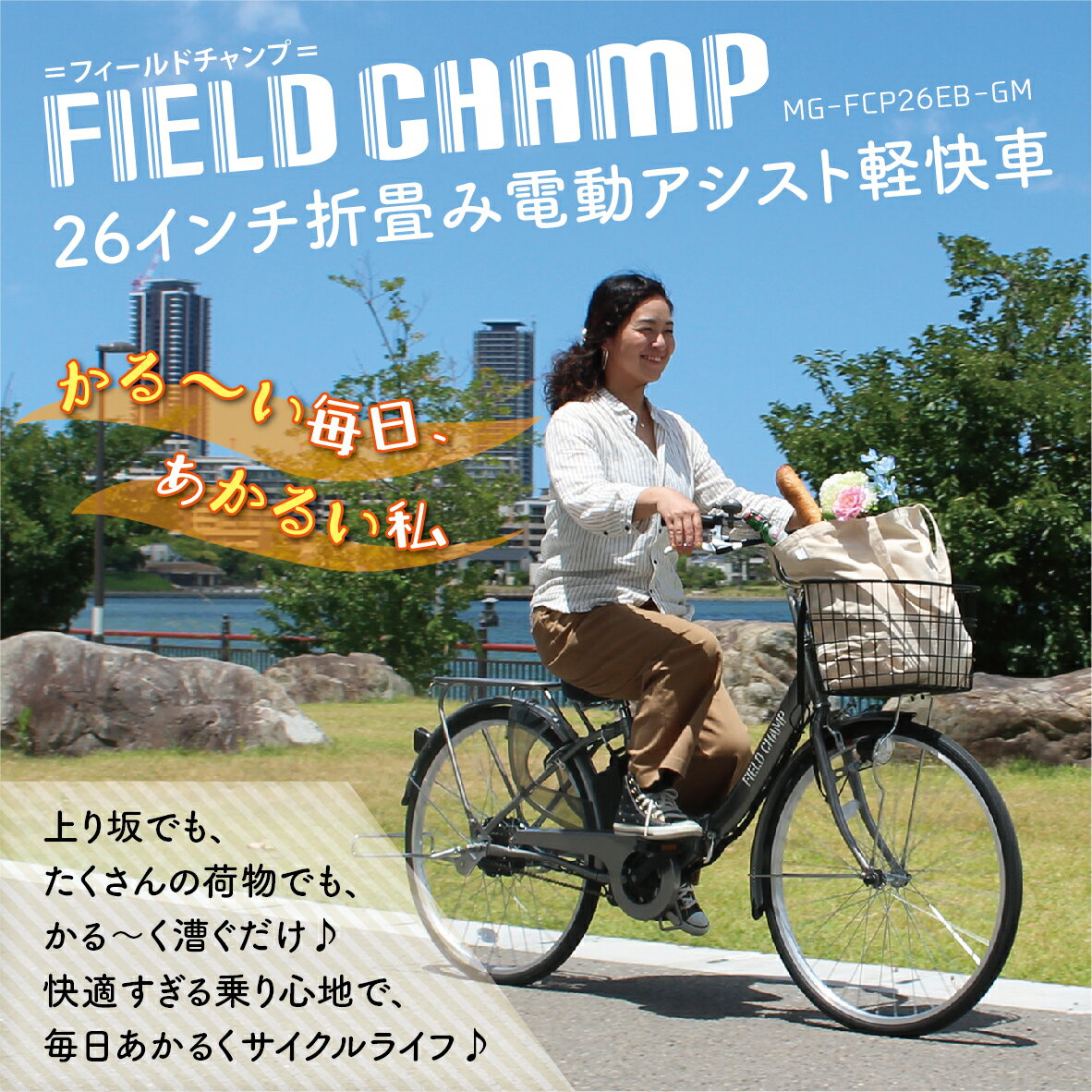 FIELD CHAMP/フィールドチャンプ26インチ電動アシスト折畳軽快車MG-FCP26EB-GM(ガンメタ)ミムゴ型式認定番号(TSマーク)LEDライト 折りたたみ シングルギア アシスト機能5.8Ah カゴ サークルキー 安い 電動自転車 シティサイクル バッテリー