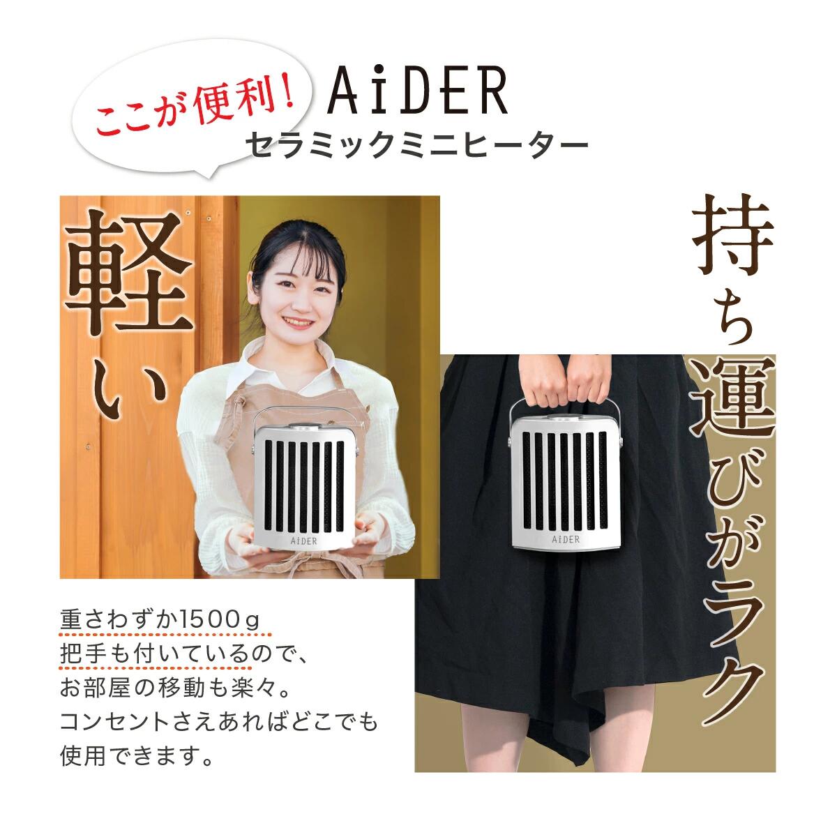トイレや脱衣所のような狭い個室に置くなら、AIDERセラミックミニヒーターがぴったりです。