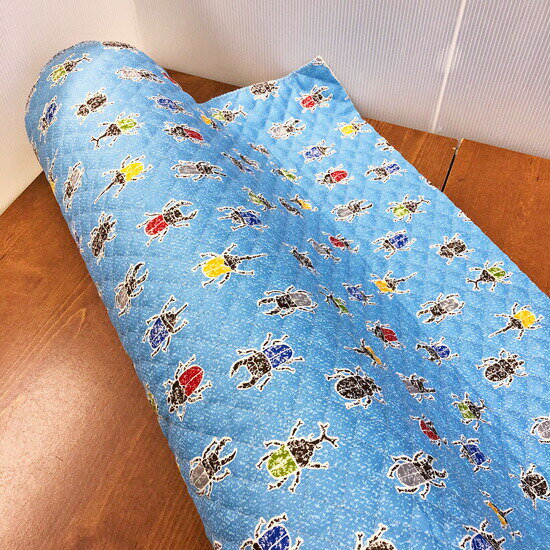 ●図鑑シリーズキルティング生地/世界の昆虫柄の生地/カマキリ・カブトムシ・ヘラクレスオオカブトなどいろいろな世界の昆虫がプリントされたキルト生地です/キルティング生地/入園入学/通園バッグ/レッスンバッグ/シューズバッグ/巾着袋/虫柄/N22